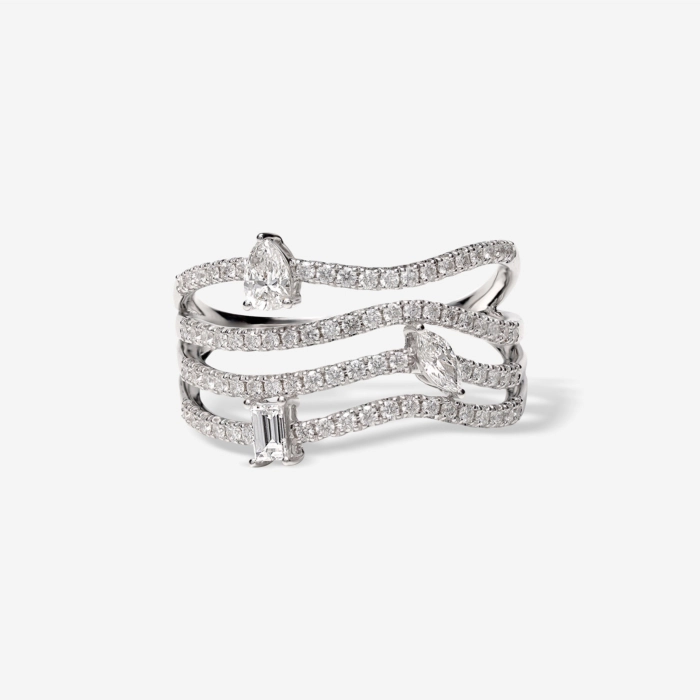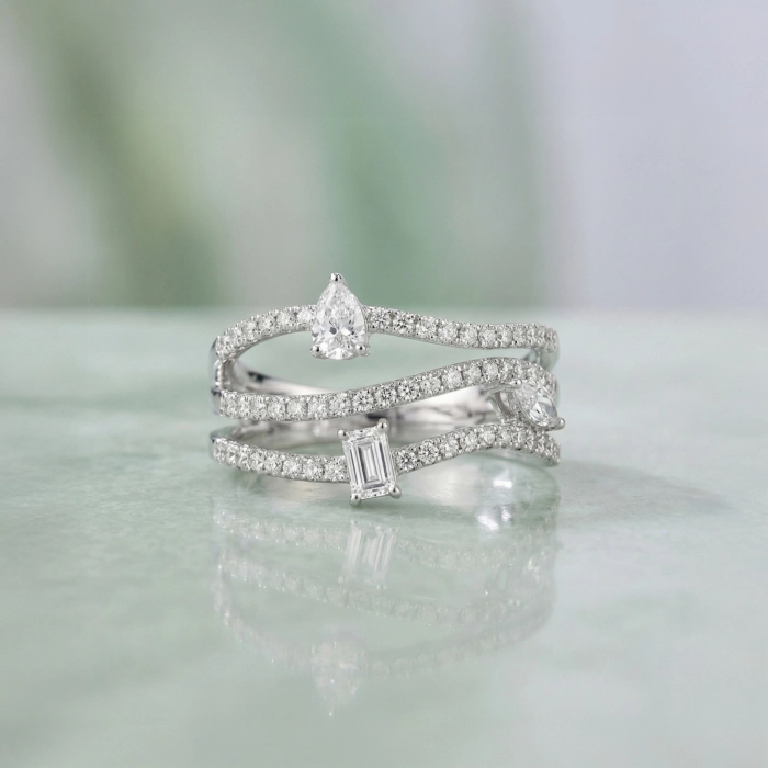 Layered Diamond Flow Ring featuring multiple curved bands adorned with sparkling diamonds and mixed stone cuts. A sleek, modern design that flows gracefully, offering elegance, brilliance, and a bold statement look.